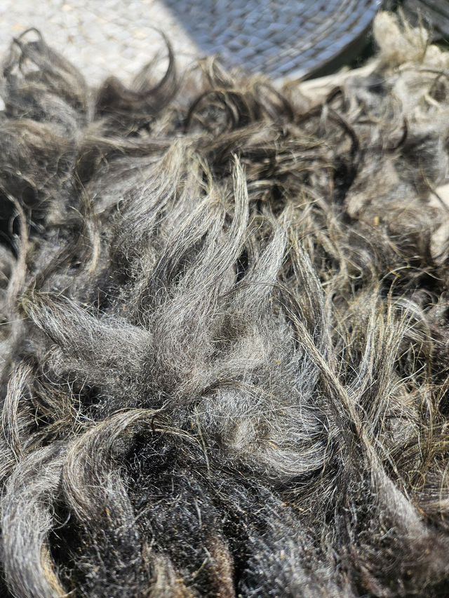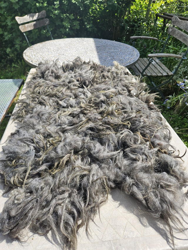 Toison de Thônes et Marthod "grise", brute, triée. Très peu de débris végétaux. Mèches de 10 à 15 cm. Le poids des toisons varient entre 0.6 kg et 1.2 kg